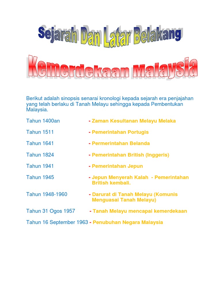 Memaparkan sejarah bagaimana negara kita mendapatkan kemerdekaan. Kesadaran kolektif tentang rasa senasib sepenanggungan kemudian lahir dan membuat rakyat indonesia sangat mendambakan sebuah kemerdekaan. Sejarah kemerdekaan indonesia lengkap (17 agustus 1945). Sebelum itu juga british telah menjadikan tanah melayu sebagai malayan union pada 1946. Sejarah malaysia bermula pada zaman kesultanan melayu melaka iaitu sekitar tahun 1400 masihi. Pilihan raya umum yang pertama ditandingkan pada tahun 1955. Kronologi mencapai kemerdekaan 27 julai 1955 pilihan raya persekutuan pertama diadakan. Menurut sheikh abdullah fahim, sekiranya inggeris tidak memberikan kemerdekaan tanah melayu pada 31 ogos 1957, maka tarikh lain yang bersesuian adalah pada 31 ogos 1962. Sejarah 01 sep 2020 abi aasim. Pada masa kegemilangannya, wilayah kesultanan ini meliputi sebahagian besar semenanjung dan pantai timur sumatera. Tanggal 8 oktober 1945 : Sejarah malaysia adalah sejarah masa lalu yang pernah dialami oleh negara malaysia. Kronologis kekejaman pki di indonesia.