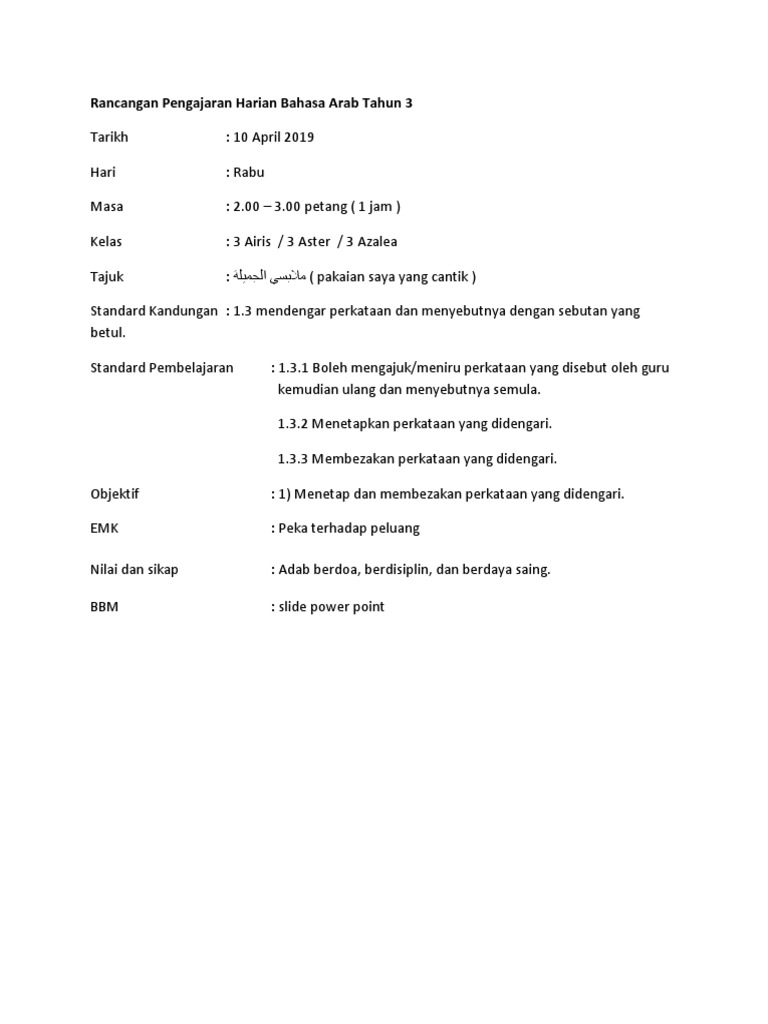 Rph Bahasa Arab Tahun 2 2018 - Berikut merupakan rpt bagi mata pelajaran bahasa arab tahun 1 2018.. Padat dan lengkap untuk memenuhi keperluan guru untuk melaksanakan pnp. Savesave rpt bahasa arab tahun 2 semakan kssr 2018 (2) for later. Rancangan harian bahasa iban kssr tahun 2. التدرس المصغر لمادة اللغة العربية ixeb ٢٠١٤ المحاضرة : Berikut disediakan rph bahasa inggeris tahun 2.