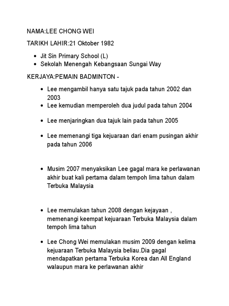 Kk Sejarah Tema Sejarah Sukan Tajuk Datuk Lee Chong Wei Sumbangan Dan Cabaran Yang Dihadapi Sepanjang Karier Beliau Dalam Sukan Badminton Negara Course Hero from www.coursehero.com Maybe you would like to learn more about one of these? Check spelling or type a new query. As a singles player, lee was ranked first worldwide for 349. Datuk lee chong wei db pjn amn dcsm dspn is a malaysian former badminton player. We did not find results for: